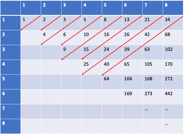 - v[i][j] = fib(i) * fib(j) 라고하고 표를 만들면 다음과 같다